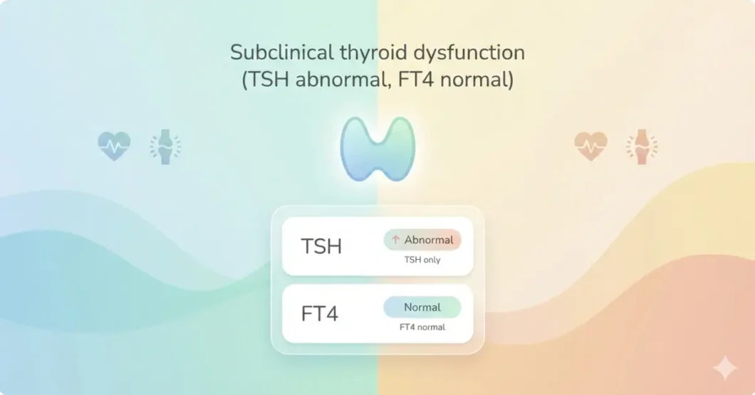 潜在性甲状腺機能異常(サブクリニカル)は、TSHのみが異常で、FT4(必要に応じFT3)が基準範囲内にある状態を指します。