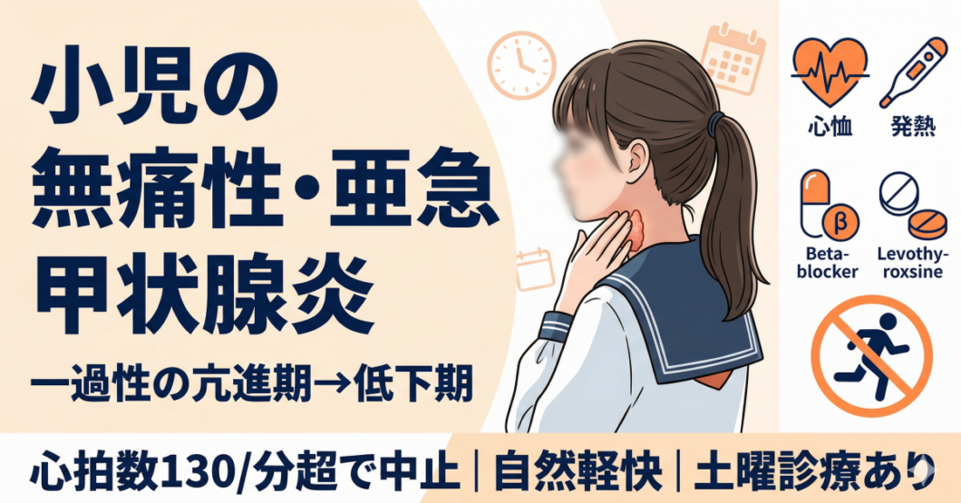 小児の無痛性・亜急性甲状腺炎は一過性の亢進期→低下期をたどることが多い病態です。発熱や頸部痛の有無に関わらず、TSH/FT4(±FT3)とエコーで評価し、病期に応じて運動強度を調整します。